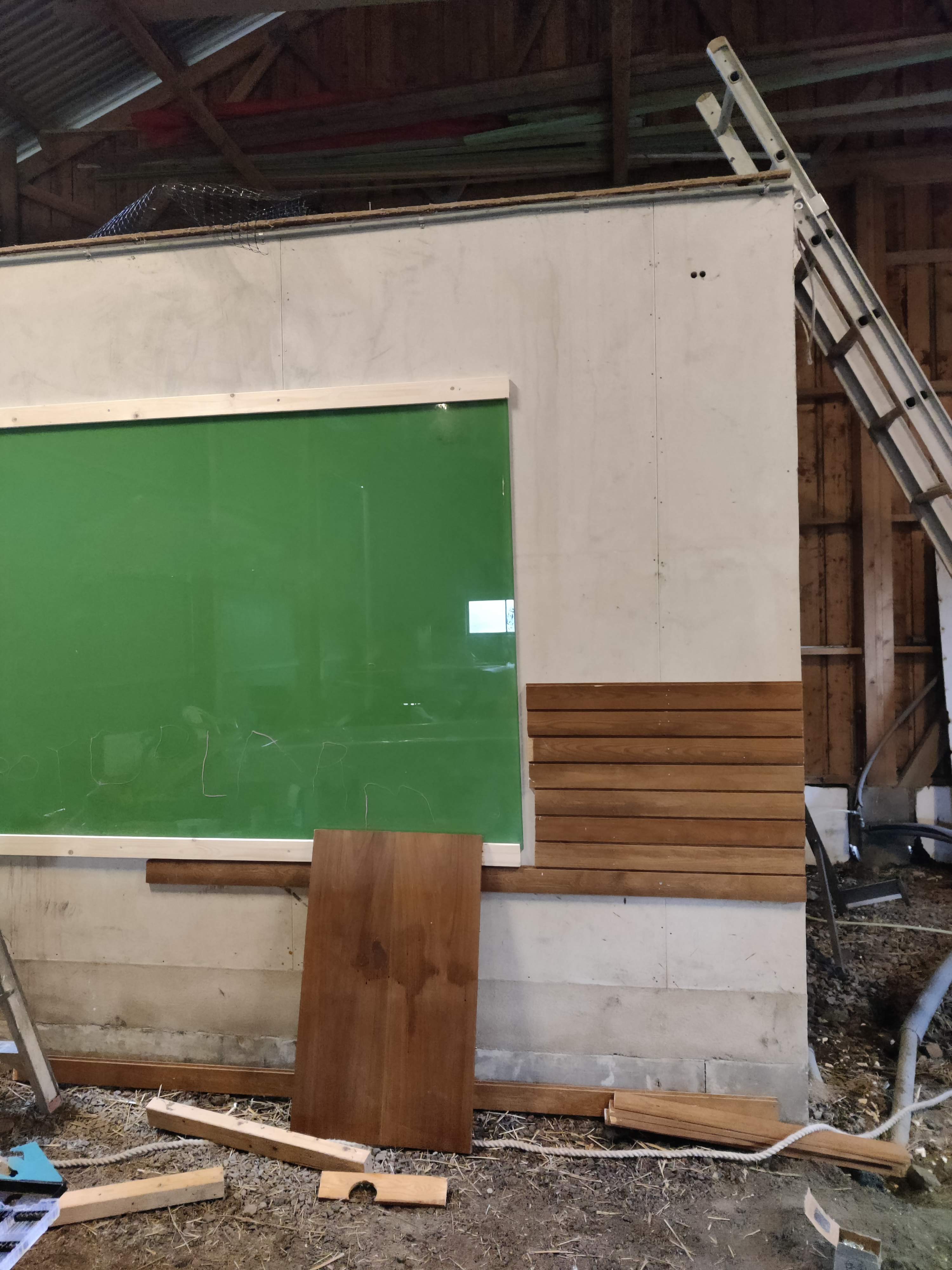 Kontorets vägg i maskinhallen har jag klätt in med återbrukad råspånt. Mitt på väggen en stoooor glasskiva som jag använder som whiteboard med veckans schema.