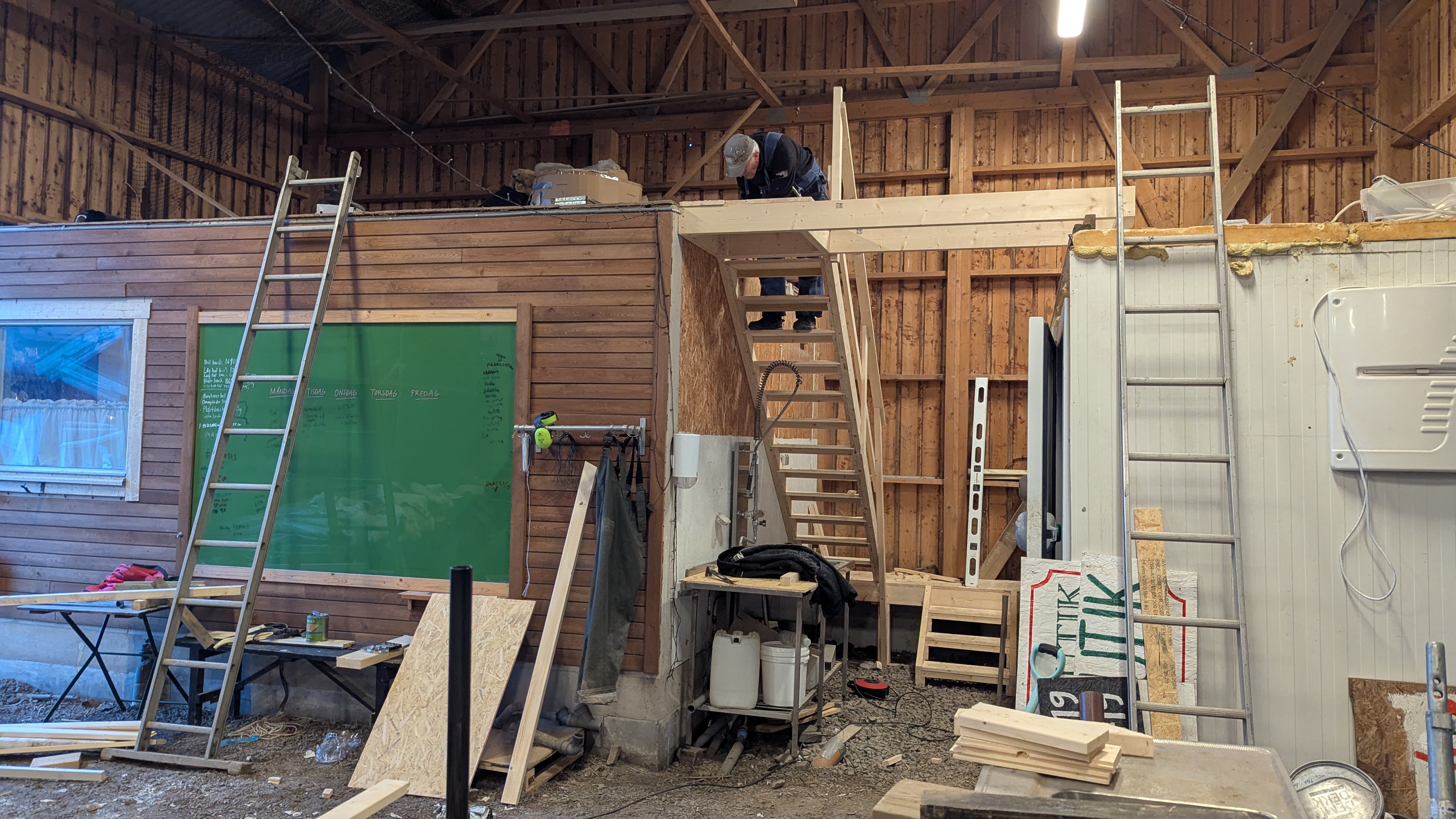 Ovanpå det som är kontor & gårdsbutik finns en lika stora yta. Ja, takytan är ju faktiskt lite större än golvytan till och med, utan väggar o jox. I tre år har jag klättrat på stege med virke, nät, backar och diverse för det är ju en sån himla bra plats att förvara skrymmande grejer som inte används så ofta. Men bära på stege…. Känns inte alltid så säkert. Min pappa (igen!) nappade snabbt och hade snart en ritning klar. Så himla fint! Bättre än jag kunnat föreställa mig! På köpet fick diskbänken och kylrummet en inramning hänger ihop med kontorsdelen som en kropp. Mysigt! Ok, kanske lite att ta i, men nära på!