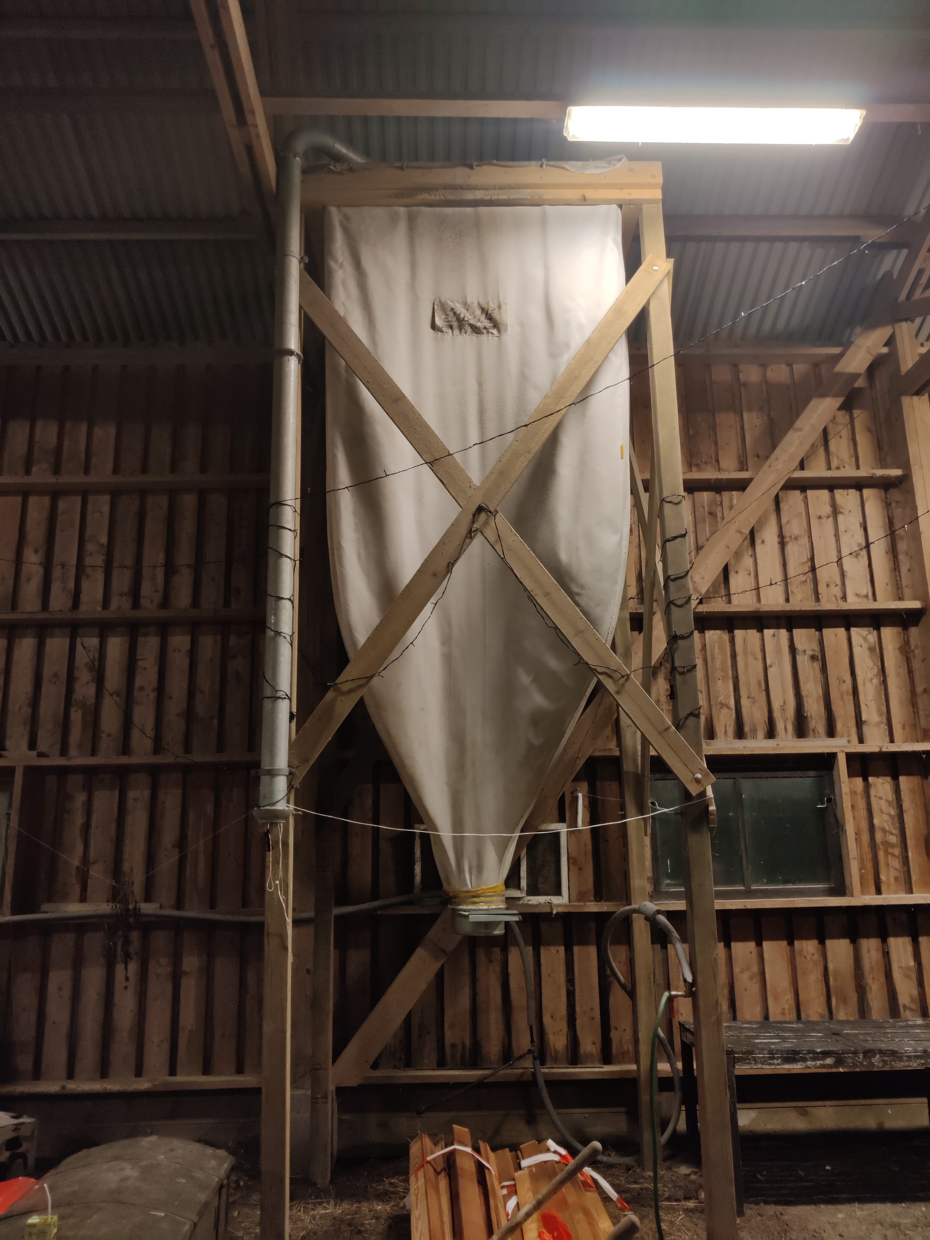 Monterat ner en liten ”hage” inne i maskinhallen och en silo som stod bredvid. Hur fick vi ner den? Jag minns inte hur det gick till, den var ju så himla stor (hög!) och tung! Jag skänkte mjukdelarna (”säcken”) till en bonde i närheten, hoppas den kommit till användning hos honom.