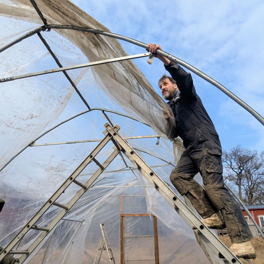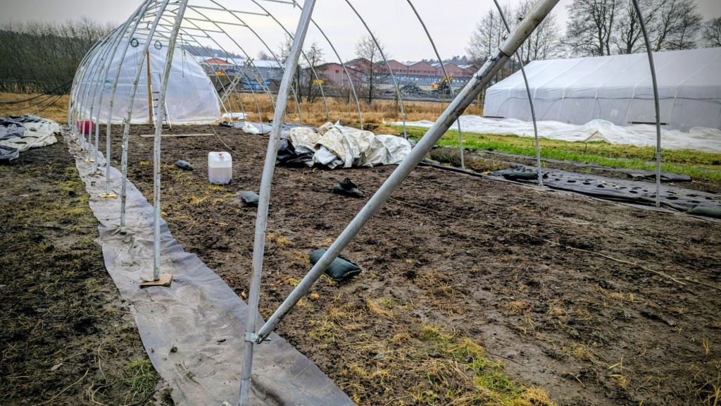 Helgens arbetstimmar landade på fem timmar för två personer (runtomkring fix och flytt av bågar) och 1,5 timme för tre personer (lägga på plasten och få fast). Ändå helt okej för ett växthus på 100 kvadrat. Geggan är påfrestande, men kanske är det oundvikligt den här tiden på året?