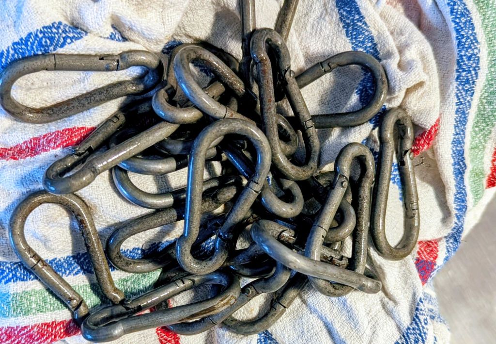 Efter bara två säsonger var karbinhakarna superrostiga. Några var så rostiga att de knappt gick att öppna. Anmärkningsvärt dåligt tycker jag! Jag tog med dem hem över natten och lät de ligga i ättika över natten, detta fantastiska husmorstrick för att bli av med rost. Mina sekatörer har fått samma behandling över vintern (men dom är å andra sidan inte gjorda för att lämnas ute i ur och skur). Sedan på med lite go linolja för att smörja och mjuka upp.